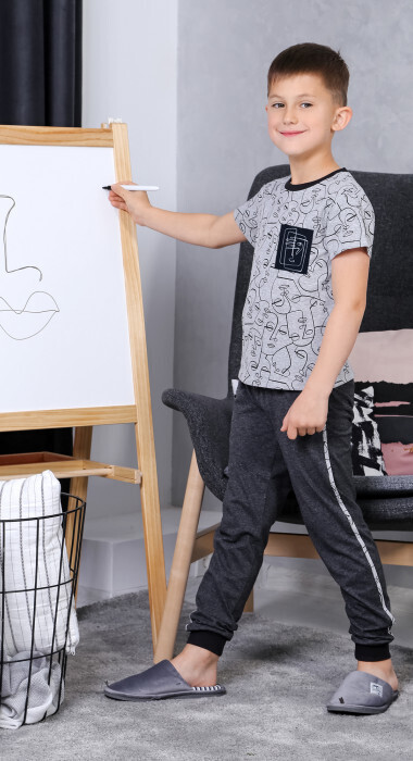 арт. 44с КОСТЮМ ДЛЯ МАЛЬЧИКА состоящий из футболки из полотна эксклюзивного дизайна и меланжированных брюк. Футболка со слегка спущенной линией плеч, принтом, имитирующим карман. Брюки на притачном поясе с отстроченной эластичной тесьмой, карманами, кантами в боковых швах, с манжетами по низу. Деталь вдоль горловины и манжеты брюк выполнены из "рибаны". В коллекции представлена подобная мужская модель.