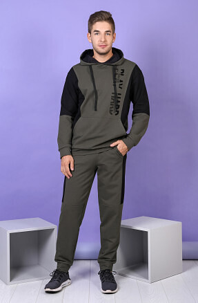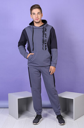 АРТ. 442Р Костюм мужской из футера. Джемпер с контрастными вставками по рукавам, с карманом "кенгуру", капюшоном со шнуром; рукава с манжетами. Брюки с контрастными вставками, с боковыми карманами, на притачном поясе со шнуром и отстроченной эластичной тесьмой, на манжетах по низу.