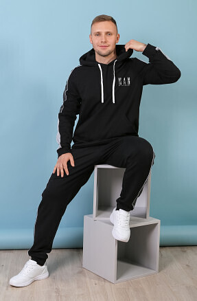 арт.316с Костюм мужской из футера. Джемпер с контрастными вставками по плечам и рукавам, с карманом "кенгуру", капюшоном со шнуром; рукава с манжетами. Брюки с контрастными вставками, с боковыми карманами, на притачном поясе со шнуром и отстроченной эластичной тесьмой, на манжетах по низу.