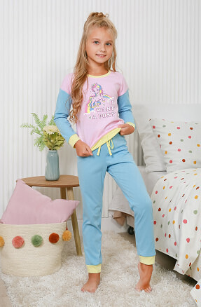 арт. 307с ПИЖАМА ДЛЯ ДЕВОЧКИ -Комплект для девочки, состоящий из джемпера (с принтом) и брючек. Джемпер со спущенной линией пройм, с манжетами по низу стана и рукавов. Брючки с контрастными манжетами по низу и декоративным шнурочком вверху.