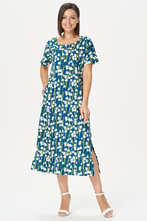 50.52. Платье прямого силуэта из трикотажного полотна качества пенье. Круглый вырез горловины, спущенная линия плеча, цельнокроенные короткие рукава с манжетами, в боковых швах карманы и по низу разрезы. Длина изделия ниже колена. Цвет: индиго. Состав: 100% хлопок. Тип полотна: Кулирка. арт. 176с-N0300-F68